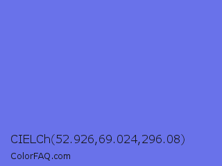 CIELCh 52.926,69.024,296.08 Color is a light blue color and the nearest color is Medium Slate Blue #7b68ee. Hex code #6972ea and RGB value is rgb(105,114,234). In RGB color space, this color is composed of 41% red, 45% green, 92% blue, In CMYK color space, this color is composed of 55% cyan, 51% magenta, 0% yellow , 8% black , In HSL color space, this color has a hue angle of 236° , 75% saturation and 66% lightness.