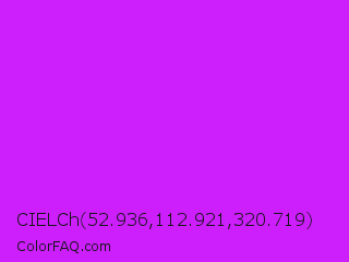 CIELCh 52.936,112.921,320.719 Color is a normal purple color and the nearest color is Vivid Orchid #cc00ff. Hex code #cd1ffc and RGB value is rgb(205,31,252). In RGB color space, this color is composed of 80% red, 12% green, 99% blue, In CMYK color space, this color is composed of 19% cyan, 88% magenta, 0% yellow , 1% black , In HSL color space, this color has a hue angle of 287° , 97% saturation and 55% lightness.