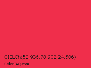 CIELCh 52.936,78.902,24.506 Color is a normal red color and the nearest color is Amaranth #e52b50. Hex code #f02e4b and RGB value is rgb(240,46,75). In RGB color space, this color is composed of 94% red, 18% green, 29% blue, In CMYK color space, this color is composed of 0% cyan, 81% magenta, 69% yellow , 6% black , In HSL color space, this color has a hue angle of 351° , 87% saturation and 56% lightness.