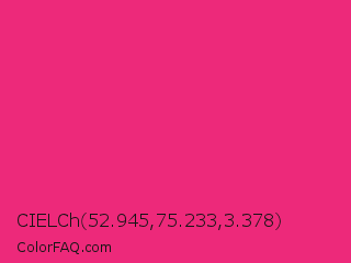 CIELCh 52.945,75.233,3.378 Color is a normal rose color and the nearest color is Razzmatazz #e3256b. Hex code #ed297a and RGB value is rgb(237,41,122). In RGB color space, this color is composed of 93% red, 16% green, 48% blue, In CMYK color space, this color is composed of 0% cyan, 83% magenta, 49% yellow , 7% black , In HSL color space, this color has a hue angle of 335° , 84% saturation and 55% lightness.