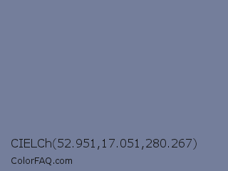 CIELCh 52.951,17.051,280.267 Color is a normal blue color and the nearest color is Rhythm #777696. Hex code #747e9b and RGB value is rgb(116,126,155). In RGB color space, this color is composed of 45% red, 49% green, 61% blue, In CMYK color space, this color is composed of 25% cyan, 19% magenta, 0% yellow , 39% black , In HSL color space, this color has a hue angle of 225° , 16% saturation and 53% lightness.