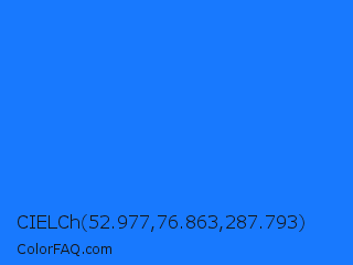 CIELCh 52.977,76.863,287.793 Color is a normal blue color and the nearest color is Blue Crayola #1f75fe. Hex code #1879fe and RGB value is rgb(24,121,254). In RGB color space, this color is composed of 9% red, 47% green, 100% blue, In CMYK color space, this color is composed of 91% cyan, 52% magenta, 0% yellow , 0% black , In HSL color space, this color has a hue angle of 215° , 99% saturation and 55% lightness.