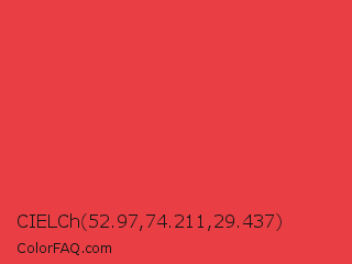 CIELCh 52.97,74.211,29.437 Color is a normal red color and the nearest color is Carmine Pink #eb4c42. Hex code #e83e44 and RGB value is rgb(232,62,68). In RGB color space, this color is composed of 91% red, 24% green, 27% blue, In CMYK color space, this color is composed of 0% cyan, 73% magenta, 71% yellow , 9% black , In HSL color space, this color has a hue angle of 358° , 79% saturation and 58% lightness.