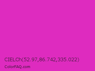 CIELCh 52.97,86.742,335.022 Color is a normal magenta color and the nearest color is Steel Pink #cc33cc. Hex code #de2bbf and RGB value is rgb(222,43,191). In RGB color space, this color is composed of 87% red, 17% green, 75% blue, In CMYK color space, this color is composed of 0% cyan, 81% magenta, 14% yellow , 13% black , In HSL color space, this color has a hue angle of 310° , 73% saturation and 52% lightness.