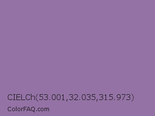 CIELCh 53.001,32.035,315.973 Color is a normal purple color and the nearest color is Wisteria #9771b5. Hex code #9472a5 and RGB value is rgb(148,114,165). In RGB color space, this color is composed of 58% red, 45% green, 65% blue, In CMYK color space, this color is composed of 10% cyan, 31% magenta, 0% yellow , 35% black , In HSL color space, this color has a hue angle of 280° , 22% saturation and 55% lightness.