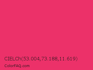 CIELCh 53.004,73.188,11.619 Color is a normal rose color and the nearest color is Razzmatazz #e3256b. Hex code #ec3169 and RGB value is rgb(236,49,105). In RGB color space, this color is composed of 93% red, 19% green, 41% blue, In CMYK color space, this color is composed of 0% cyan, 79% magenta, 56% yellow , 7% black , In HSL color space, this color has a hue angle of 342° , 83% saturation and 56% lightness.