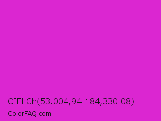 CIELCh 53.004,94.184,330.08 Color is a normal magenta color and the nearest color is Steel Pink #cc33cc. Hex code #db26d1 and RGB value is rgb(219,38,209). In RGB color space, this color is composed of 86% red, 15% green, 82% blue, In CMYK color space, this color is composed of 0% cyan, 83% magenta, 5% yellow , 14% black , In HSL color space, this color has a hue angle of 303° , 72% saturation and 50% lightness.