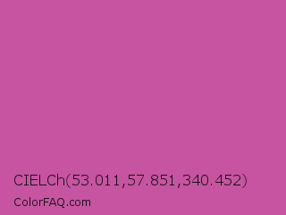 CIELCh 53.011,57.851,340.452 Color is a normal magenta color and the nearest color is Mulberry #c54b8c. Hex code #c754a1 and RGB value is rgb(199,84,161). In RGB color space, this color is composed of 78% red, 33% green, 63% blue, In CMYK color space, this color is composed of 0% cyan, 58% magenta, 19% yellow , 22% black , In HSL color space, this color has a hue angle of 320° , 51% saturation and 55% lightness.