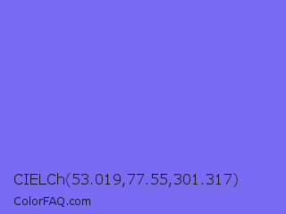 CIELCh 53.019,77.55,301.317 Color is a light indigo color and the nearest color is Medium Slate Blue #7b68ee. Hex code #7a6bf2 and RGB value is rgb(122,107,242). In RGB color space, this color is composed of 48% red, 42% green, 95% blue, In CMYK color space, this color is composed of 50% cyan, 56% magenta, 0% yellow , 5% black , In HSL color space, this color has a hue angle of 247° , 84% saturation and 68% lightness.