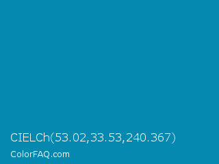 CIELCh 53.02,33.53,240.367 Color is a normal blue color and the nearest color is Blue Munsell #0093af. Hex code #0689b0 and RGB value is rgb(6,137,176). In RGB color space, this color is composed of 2% red, 54% green, 69% blue, In CMYK color space, this color is composed of 97% cyan, 22% magenta, 0% yellow , 31% black , In HSL color space, this color has a hue angle of 194° , 93% saturation and 36% lightness.