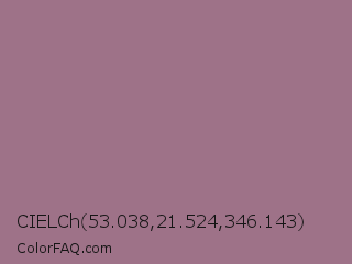 CIELCh 53.038,21.524,346.143 Color is a normal rose color and the nearest color is Mountbatten Pink #997a8d. Hex code #9e7288 and RGB value is rgb(158,114,136). In RGB color space, this color is composed of 62% red, 45% green, 53% blue, In CMYK color space, this color is composed of 0% cyan, 28% magenta, 14% yellow , 38% black , In HSL color space, this color has a hue angle of 330° , 18% saturation and 53% lightness.