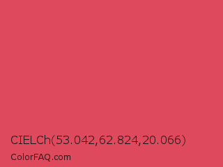 CIELCh 53.042,62.824,20.066 Color is a normal red color and the nearest color is Mandy #e25465. Hex code #de495d and RGB value is rgb(222,73,93). In RGB color space, this color is composed of 87% red, 29% green, 36% blue, In CMYK color space, this color is composed of 0% cyan, 67% magenta, 58% yellow , 13% black , In HSL color space, this color has a hue angle of 352° , 69% saturation and 58% lightness.