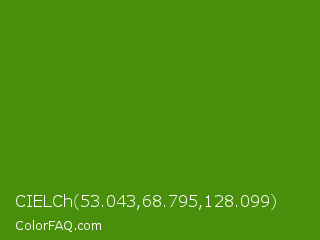 CIELCh 53.043,68.795,128.099 Color is a dark green color and the nearest color is Vida Loca #549019. Hex code #498f0b and RGB value is rgb(73,143,11). In RGB color space, this color is composed of 29% red, 56% green, 4% blue, In CMYK color space, this color is composed of 49% cyan, 0% magenta, 92% yellow , 44% black , In HSL color space, this color has a hue angle of 92° , 86% saturation and 30% lightness.