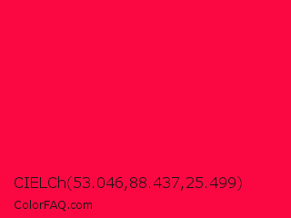 CIELCh 53.046,88.437,25.499 Color is a normal red color and the nearest color is American Rose #ff033e. Hex code #fb0843 and RGB value is rgb(251,8,67). In RGB color space, this color is composed of 98% red, 3% green, 26% blue, In CMYK color space, this color is composed of 0% cyan, 97% magenta, 73% yellow , 2% black , In HSL color space, this color has a hue angle of 345° , 97% saturation and 51% lightness.