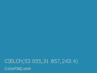 CIELCh 53.055,31.857,243.4 Color is a normal blue color and the nearest color is Eastern Blue #1e9ab0. Hex code #2588af and RGB value is rgb(37,136,175). In RGB color space, this color is composed of 15% red, 53% green, 69% blue, In CMYK color space, this color is composed of 79% cyan, 22% magenta, 0% yellow , 31% black , In HSL color space, this color has a hue angle of 197° , 65% saturation and 42% lightness.