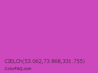 CIELCh 53.062,73.868,331.755 Color is a normal magenta color and the nearest color is Fuchsia Pink #c154c1. Hex code #cc48bc and RGB value is rgb(204,72,188). In RGB color space, this color is composed of 80% red, 28% green, 74% blue, In CMYK color space, this color is composed of 0% cyan, 65% magenta, 8% yellow , 20% black , In HSL color space, this color has a hue angle of 307° , 56% saturation and 54% lightness.