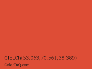 CIELCh 53.063,70.561,38.389 Color is a normal red color and the nearest color is Punch #dc4333. Hex code #de4d36 and RGB value is rgb(222,77,54). In RGB color space, this color is composed of 87% red, 30% green, 21% blue, In CMYK color space, this color is composed of 0% cyan, 65% magenta, 76% yellow , 13% black , In HSL color space, this color has a hue angle of 8° , 72% saturation and 54% lightness.