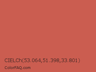 CIELCh 53.064,51.398,33.801 Color is a normal red color and the nearest color is Cedar Chest #c95a49. Hex code #cb5d50 and RGB value is rgb(203,93,80). In RGB color space, this color is composed of 80% red, 36% green, 31% blue, In CMYK color space, this color is composed of 0% cyan, 54% magenta, 61% yellow , 20% black , In HSL color space, this color has a hue angle of 6° , 54% saturation and 55% lightness.