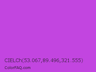 CIELCh 53.067,89.496,321.555 Color is a normal purple color and the nearest color is Medium Orchid #ba55d3. Hex code #c245e0 and RGB value is rgb(194,69,224). In RGB color space, this color is composed of 76% red, 27% green, 88% blue, In CMYK color space, this color is composed of 13% cyan, 69% magenta, 0% yellow , 12% black , In HSL color space, this color has a hue angle of 288° , 71% saturation and 57% lightness.
