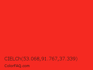 CIELCh 53.068,91.767,37.339 Color is a normal red color and the nearest color is Red Pigment #ed1c24. Hex code #f52921 and RGB value is rgb(245,41,33). In RGB color space, this color is composed of 96% red, 16% green, 13% blue, In CMYK color space, this color is composed of 0% cyan, 83% magenta, 87% yellow , 4% black , In HSL color space, this color has a hue angle of 2° , 91% saturation and 55% lightness.