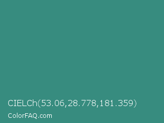 CIELCh 53.06,28.778,181.359 Color is a normal cyan color and the nearest color is Illuminating Emerald #319177. Hex code #378c7f and RGB value is rgb(55,140,127). In RGB color space, this color is composed of 22% red, 55% green, 50% blue, In CMYK color space, this color is composed of 61% cyan, 0% magenta, 9% yellow , 45% black , In HSL color space, this color has a hue angle of 171° , 44% saturation and 38% lightness.