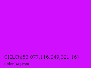 CIELCh 53.077,116.249,321.16 Color is a normal purple color and the nearest color is Vivid Orchid #cc00ff. Hex code #d10fff and RGB value is rgb(209,15,255). In RGB color space, this color is composed of 82% red, 6% green, 100% blue, In CMYK color space, this color is composed of 18% cyan, 94% magenta, 0% yellow , 0% black , In HSL color space, this color has a hue angle of 289° , 100% saturation and 53% lightness.