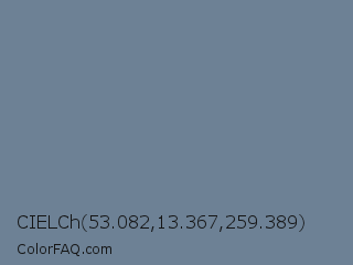 CIELCh 53.082,13.367,259.389 Color is a normal blue color and the nearest color is Slate Gray #708090. Hex code #6d8195 and RGB value is rgb(109,129,149). In RGB color space, this color is composed of 43% red, 51% green, 58% blue, In CMYK color space, this color is composed of 27% cyan, 13% magenta, 0% yellow , 42% black , In HSL color space, this color has a hue angle of 210° , 16% saturation and 51% lightness.