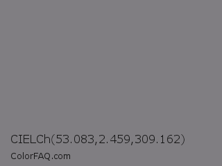 CIELCh 53.083,2.459,309.162 Color is a normal violet color and the nearest color is Gray #808080. Hex code #807e82 and RGB value is rgb(128,126,130). In RGB color space, this color is composed of 50% red, 49% green, 51% blue, In CMYK color space, this color is composed of 2% cyan, 3% magenta, 0% yellow , 49% black , In HSL color space, this color has a hue angle of 270° , 2% saturation and 50% lightness.