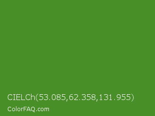 CIELCh 53.085,62.358,131.955 Color is a normal green color and the nearest color is Vida Loca #549019. Hex code #478f26 and RGB value is rgb(71,143,38). In RGB color space, this color is composed of 28% red, 56% green, 15% blue, In CMYK color space, this color is composed of 50% cyan, 0% magenta, 73% yellow , 44% black , In HSL color space, this color has a hue angle of 101° , 58% saturation and 35% lightness.