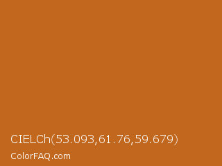 CIELCh 53.093,61.76,59.679 Color is a normal orange color and the nearest color is Piper #c96323. Hex code #c1671e and RGB value is rgb(193,103,30). In RGB color space, this color is composed of 76% red, 40% green, 12% blue, In CMYK color space, this color is composed of 0% cyan, 47% magenta, 84% yellow , 24% black , In HSL color space, this color has a hue angle of 27° , 73% saturation and 44% lightness.
