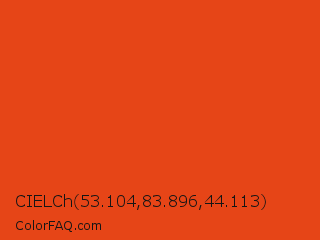 CIELCh 53.104,83.896,44.113 Color is a normal red color and the nearest color is Pomegranate #f34723. Hex code #e64517 and RGB value is rgb(230,69,23). In RGB color space, this color is composed of 90% red, 27% green, 9% blue, In CMYK color space, this color is composed of 0% cyan, 70% magenta, 90% yellow , 10% black , In HSL color space, this color has a hue angle of 13° , 82% saturation and 50% lightness.
