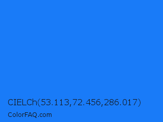 CIELCh 53.113,72.456,286.017 Color is a normal blue color and the nearest color is Blue Crayola #1f75fe. Hex code #197bf8 and RGB value is rgb(25,123,248). In RGB color space, this color is composed of 10% red, 48% green, 97% blue, In CMYK color space, this color is composed of 90% cyan, 50% magenta, 0% yellow , 3% black , In HSL color space, this color has a hue angle of 214° , 94% saturation and 54% lightness.