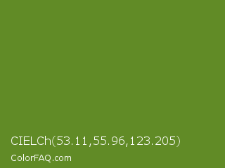 CIELCh 53.11,55.96,123.205 Color is a normal green color and the nearest color is Olive Drab #6b8e23. Hex code #618b26 and RGB value is rgb(97,139,38). In RGB color space, this color is composed of 38% red, 55% green, 15% blue, In CMYK color space, this color is composed of 30% cyan, 0% magenta, 73% yellow , 45% black , In HSL color space, this color has a hue angle of 85° , 57% saturation and 35% lightness.