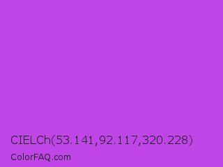 CIELCh 53.141,92.117,320.228 Color is a normal purple color and the nearest color is Medium Orchid #ba55d3. Hex code #c045e6 and RGB value is rgb(192,69,230). In RGB color space, this color is composed of 75% red, 27% green, 90% blue, In CMYK color space, this color is composed of 17% cyan, 70% magenta, 0% yellow , 10% black , In HSL color space, this color has a hue angle of 286° , 76% saturation and 59% lightness.