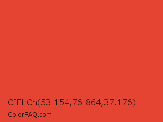 CIELCh 53.154,76.864,37.176 Color is a normal red color and the nearest color is Cinnabar #e34234. Hex code #e64432 and RGB value is rgb(230,68,50). In RGB color space, this color is composed of 90% red, 27% green, 20% blue, In CMYK color space, this color is composed of 0% cyan, 70% magenta, 78% yellow , 10% black , In HSL color space, this color has a hue angle of 6° , 78% saturation and 55% lightness.