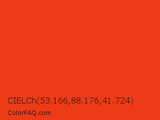 CIELCh 53.166,88.176,41.724 Color is a normal red color and the nearest color is Pomegranate #f34723. Hex code #ed3b18 and RGB value is rgb(237,59,24). In RGB color space, this color is composed of 93% red, 23% green, 9% blue, In CMYK color space, this color is composed of 0% cyan, 75% magenta, 90% yellow , 7% black , In HSL color space, this color has a hue angle of 10° , 86% saturation and 51% lightness.