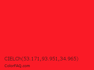 CIELCh 53.171,93.951,34.965 Color is a normal red color and the nearest color is Red Pigment #ed1c24. Hex code #fa1a26 and RGB value is rgb(250,26,38). In RGB color space, this color is composed of 98% red, 10% green, 15% blue, In CMYK color space, this color is composed of 0% cyan, 90% magenta, 85% yellow , 2% black , In HSL color space, this color has a hue angle of 357° , 96% saturation and 54% lightness.
