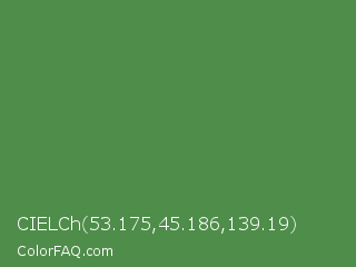 CIELCh 53.175,45.186,139.19 Color is a normal green color and the nearest color is May Green #4c9141. Hex code #4f8d4a and RGB value is rgb(79,141,74). In RGB color space, this color is composed of 31% red, 55% green, 29% blue, In CMYK color space, this color is composed of 44% cyan, 0% magenta, 48% yellow , 45% black , In HSL color space, this color has a hue angle of 116° , 31% saturation and 42% lightness.