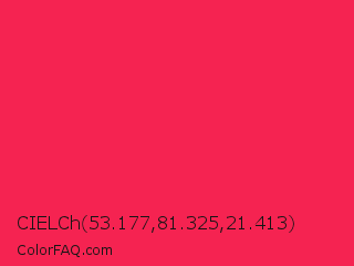CIELCh 53.177,81.325,21.413 Color is a normal red color and the nearest color is Red Crayola #ee204d. Hex code #f52351 and RGB value is rgb(245,35,81). In RGB color space, this color is composed of 96% red, 14% green, 32% blue, In CMYK color space, this color is composed of 0% cyan, 86% magenta, 67% yellow , 4% black , In HSL color space, this color has a hue angle of 347° , 91% saturation and 55% lightness.