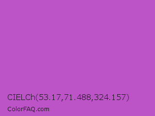 CIELCh 53.17,71.488,324.157 Color is a normal magenta color and the nearest color is Fuchsia Pink #c154c1. Hex code #bc54c8 and RGB value is rgb(188,84,200). In RGB color space, this color is composed of 74% red, 33% green, 78% blue, In CMYK color space, this color is composed of 6% cyan, 58% magenta, 0% yellow , 22% black , In HSL color space, this color has a hue angle of 294° , 51% saturation and 56% lightness.
