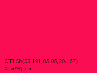 CIELCh 53.191,85.05,20.167 Color is a normal rose color and the nearest color is Folly #ff004f. Hex code #fa0d52 and RGB value is rgb(250,13,82). In RGB color space, this color is composed of 98% red, 5% green, 32% blue, In CMYK color space, this color is composed of 0% cyan, 95% magenta, 67% yellow , 2% black , In HSL color space, this color has a hue angle of 343° , 96% saturation and 52% lightness.
