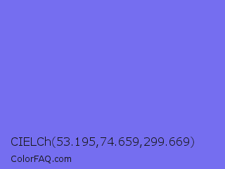 CIELCh 53.195,74.659,299.669 Color is a light indigo color and the nearest color is Medium Slate Blue #7b68ee. Hex code #756ef0 and RGB value is rgb(117,110,240). In RGB color space, this color is composed of 46% red, 43% green, 94% blue, In CMYK color space, this color is composed of 51% cyan, 54% magenta, 0% yellow , 6% black , In HSL color space, this color has a hue angle of 243° , 81% saturation and 69% lightness.