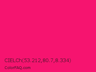 CIELCh 53.212,80.7,8.334 Color is a normal rose color and the nearest color is Vivid Raspberry #ff006c. Hex code #f6146f and RGB value is rgb(246,20,111). In RGB color space, this color is composed of 96% red, 8% green, 44% blue, In CMYK color space, this color is composed of 0% cyan, 92% magenta, 55% yellow , 4% black , In HSL color space, this color has a hue angle of 336° , 93% saturation and 52% lightness.