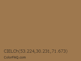 CIELCh 53.224,30.231,71.673 Color is a normal orange color and the nearest color is Dirt #9b7653. Hex code #9e784e and RGB value is rgb(158,120,78). In RGB color space, this color is composed of 62% red, 47% green, 31% blue, In CMYK color space, this color is composed of 0% cyan, 24% magenta, 51% yellow , 38% black , In HSL color space, this color has a hue angle of 32° , 34% saturation and 46% lightness.