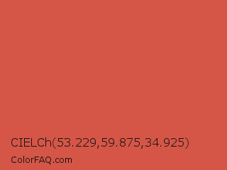 CIELCh 53.229,59.875,34.925 Color is a normal red color and the nearest color is Dark Coral #cd5b45. Hex code #d55647 and RGB value is rgb(213,86,71). In RGB color space, this color is composed of 84% red, 34% green, 28% blue, In CMYK color space, this color is composed of 0% cyan, 60% magenta, 67% yellow , 16% black , In HSL color space, this color has a hue angle of 6° , 63% saturation and 56% lightness.