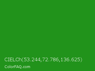 CIELCh 53.244,72.786,136.625 Color is a normal green color and the nearest color is Slimy Green #299617. Hex code #21931b and RGB value is rgb(33,147,27). In RGB color space, this color is composed of 13% red, 58% green, 11% blue, In CMYK color space, this color is composed of 78% cyan, 0% magenta, 82% yellow , 42% black , In HSL color space, this color has a hue angle of 117° , 69% saturation and 34% lightness.