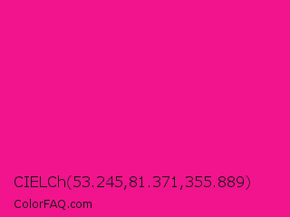 CIELCh 53.245,81.371,355.889 Color is a normal rose color and the nearest color is Fluorescent Pink #ff1493. Hex code #f2148c and RGB value is rgb(242,20,140). In RGB color space, this color is composed of 95% red, 8% green, 55% blue, In CMYK color space, this color is composed of 0% cyan, 92% magenta, 42% yellow , 5% black , In HSL color space, this color has a hue angle of 328° , 90% saturation and 51% lightness.