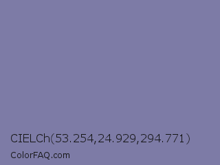 CIELCh 53.254,24.929,294.771 Color is a normal indigo color and the nearest color is Shadow Blue #778ba5. Hex code #7d7ba6 and RGB value is rgb(125,123,166). In RGB color space, this color is composed of 49% red, 48% green, 65% blue, In CMYK color space, this color is composed of 25% cyan, 26% magenta, 0% yellow , 35% black , In HSL color space, this color has a hue angle of 243° , 19% saturation and 57% lightness.