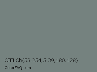 CIELCh 53.254,5.39,180.128 Color is a normal cyan color and the nearest color is Sirocco #718080. Hex code #75827f and RGB value is rgb(117,130,127). In RGB color space, this color is composed of 46% red, 51% green, 50% blue, In CMYK color space, this color is composed of 10% cyan, 0% magenta, 2% yellow , 49% black , In HSL color space, this color has a hue angle of 166° , 5% saturation and 48% lightness.