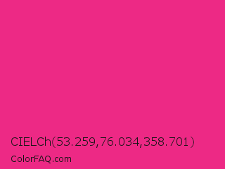 CIELCh 53.259,76.034,358.701 Color is a normal rose color and the nearest color is Barbie Pink #e0218a. Hex code #ed2985 and RGB value is rgb(237,41,133). In RGB color space, this color is composed of 93% red, 16% green, 52% blue, In CMYK color space, this color is composed of 0% cyan, 83% magenta, 44% yellow , 7% black , In HSL color space, this color has a hue angle of 332° , 84% saturation and 55% lightness.